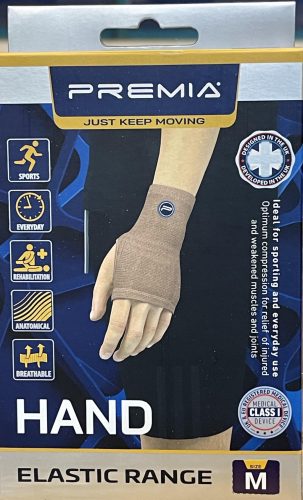 A Premia kézszorító elasztikus anyagból készült, amely gyengéd, de határozott tartást ad a csuklónak, miközben nem korlátozza a kéz mozgását. Segít csökkenteni a túlterhelésből adódó kellemetlenséget, támogatja a biztonságos mozgást és a gyorsabb regenerációt.